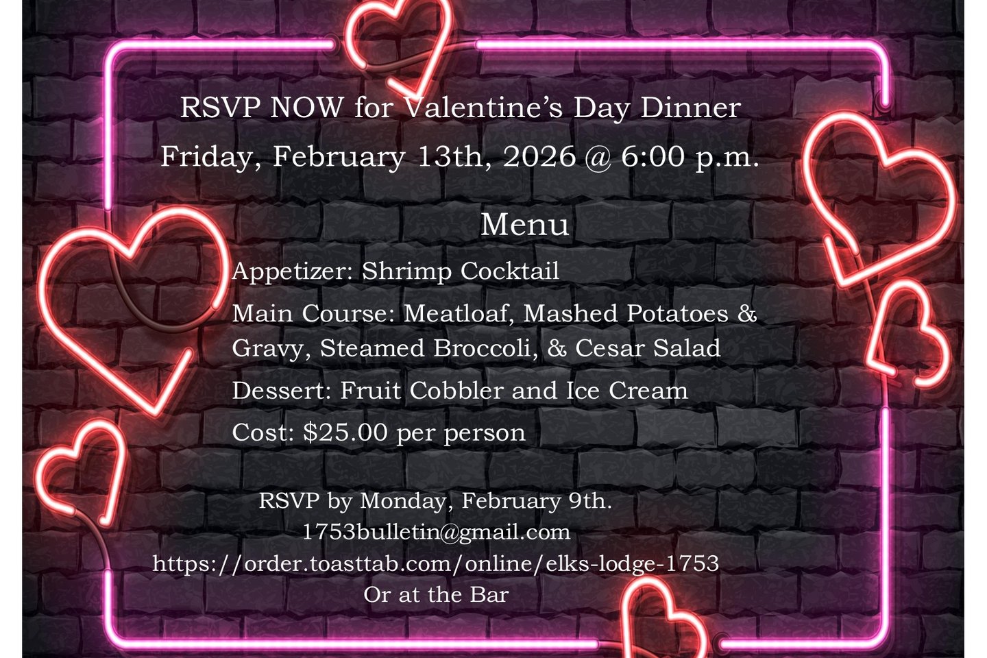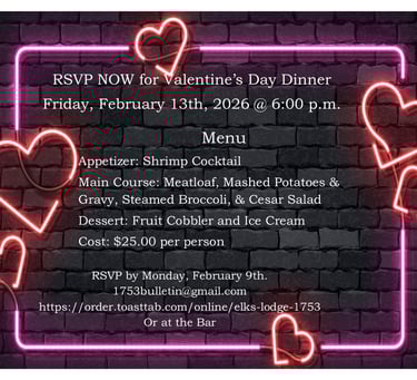 Elks Dominion View will be serving Valentine's Day Dinner